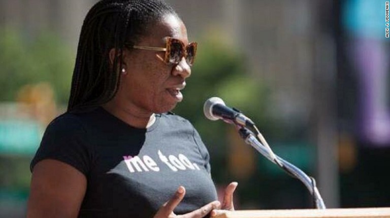 Tarana Burke, wearing a ‘me too’ T-shirt, addresses the March to End Rape Culture in Philadelphia in 2014.